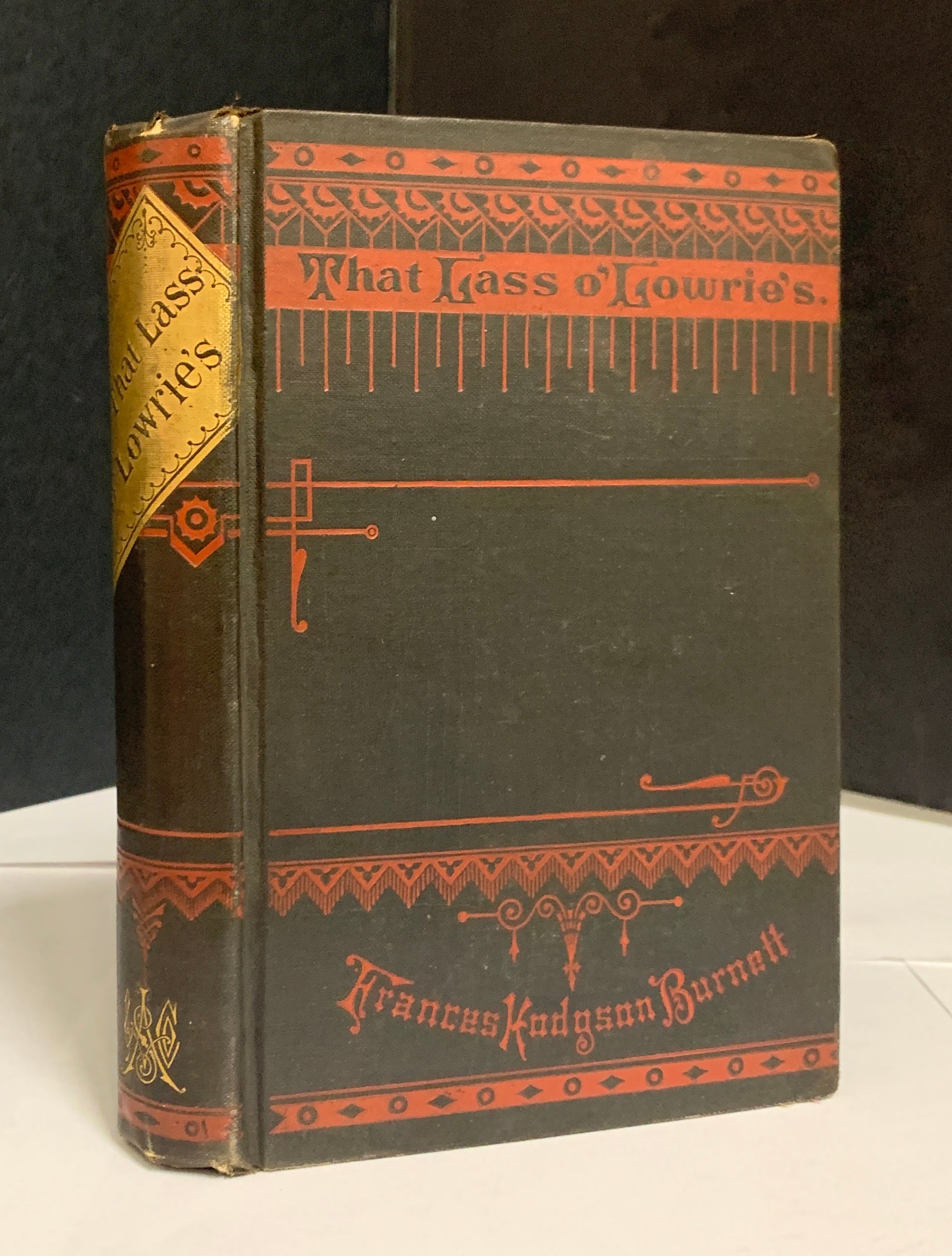 BURNETT, Frances Hodgson. That Lass o’ Lowrie’s. Illustrated by Alfred Fredericks. NY: Scribner, Armstrong, 1877. 12mo, viii 269pp + [6] advts. Black cloth decoratively stamped in red and gilt. 4 b&w plates. Spine ends, corners, and bottom edge all lightly worn, spine slightly cocked, some slight to covers, endpapers a bit aged, a touch of foxing to title, frontispiece, and tissue guard, contents lightly shaken and with a few pages hand-soiled. Still an attractive book with a surprisingly bright spine.