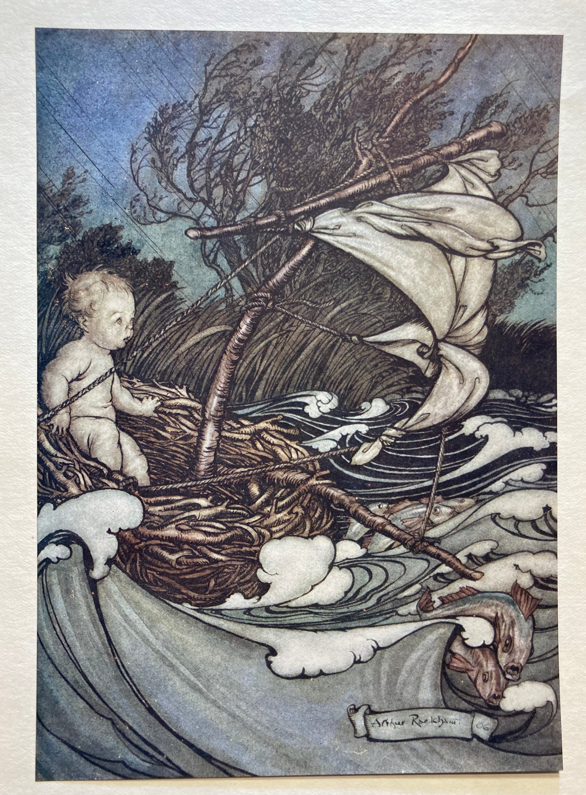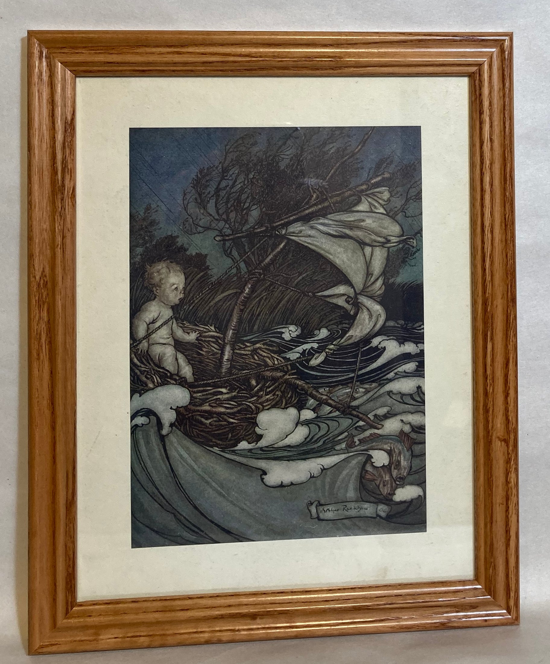 RACKHAM, Arthur. “There now arose a mighty storm, and he was tossed this way and that.” Original framed color plate from the first edition of Peter Pan in Kensington Garden, published by Hodder & Stoughton, 1906 and appearing opposite page 54 in that edition. Image measures 5” x 7” in a 8¼” x 10¼” wood frame.