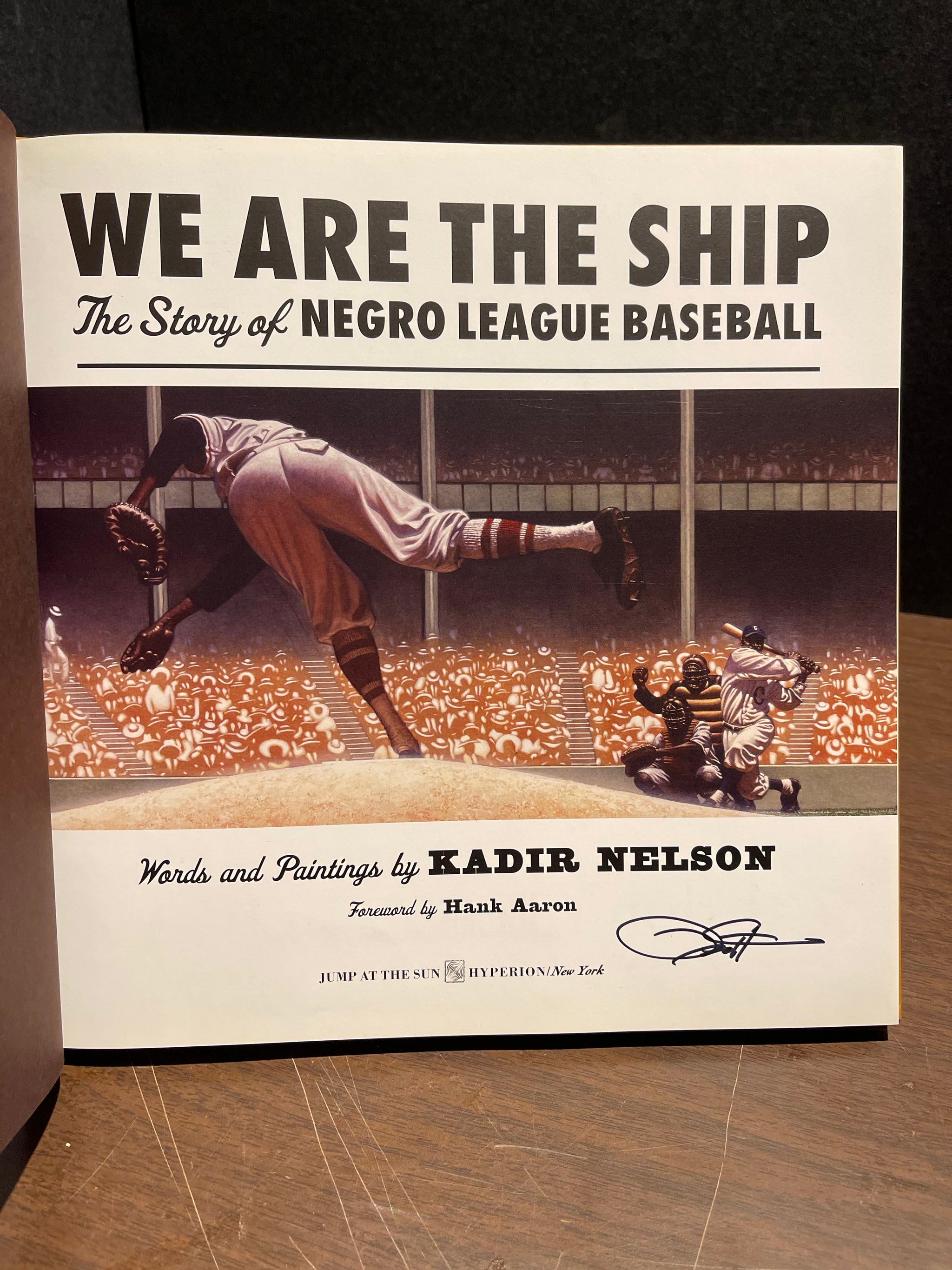 NELSON, Kadir. We Are the Ship. The Story of Negro League Baseball. Foreward by Hank Aaron. Square 8vo, [viii] 88pp. Light brown boards pictorially printed in black. Brown endpapers; color illustrations throughout. Minute rubbing to spine ends, else a fine copy in original color pictorial dust jacket (no medals affixed). Signed by the author/artist, Caldecott Medalist Kadir Nelson.