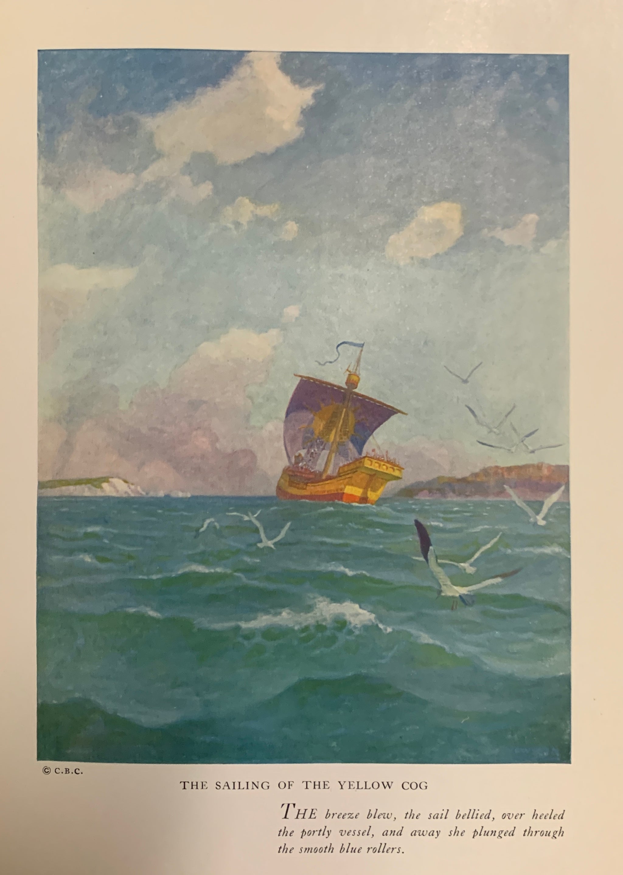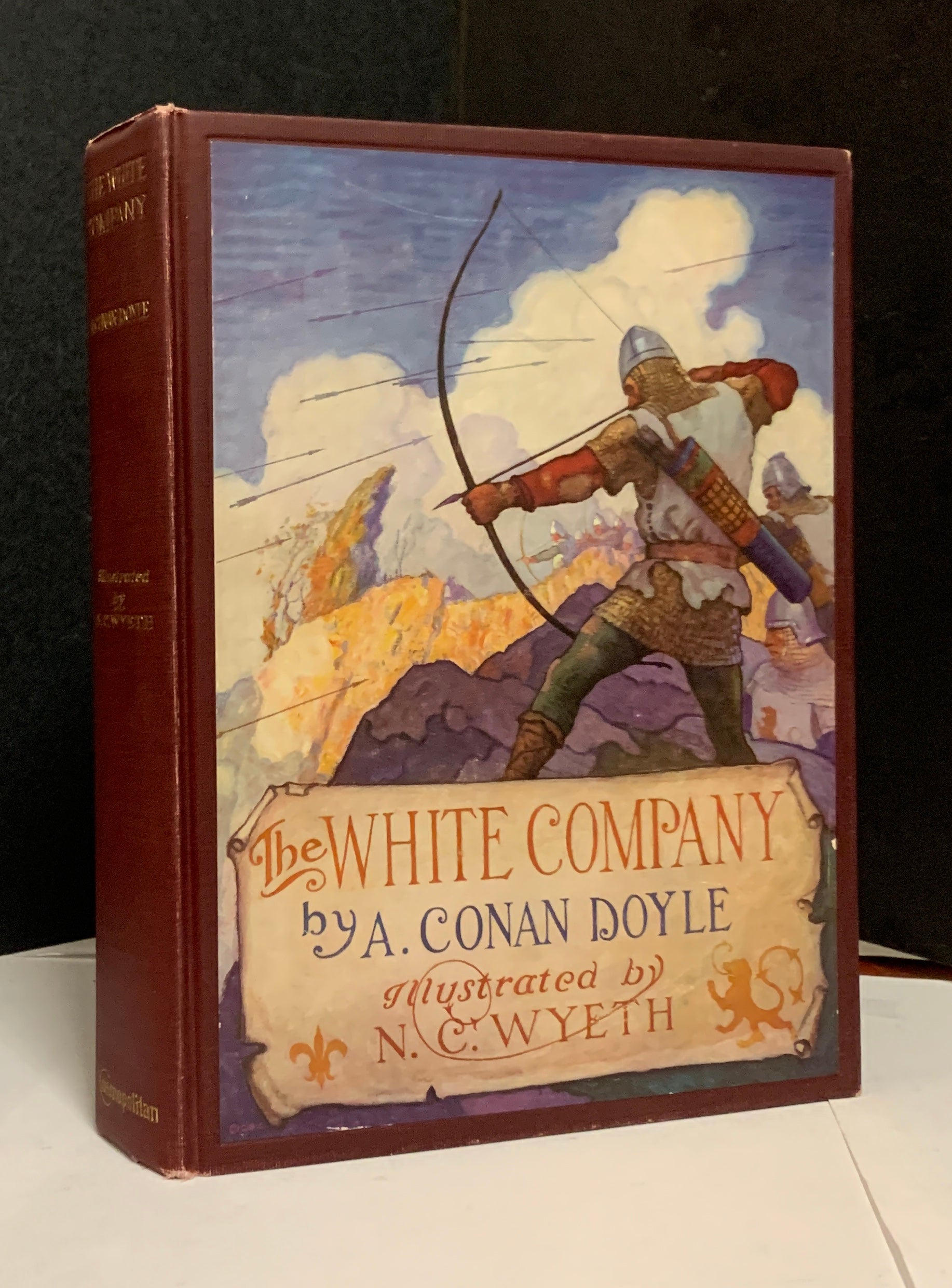 DOYLE, Arthur Conan. The White Company. Pictures by N[ewel] C[onvers] Wyeth. NY: Cosmopolitan [1922]. 8vo, [xiv] 363pp. Maroon cloth with spine stamped in gold and color pictorial label affixed to front; t.e.g. Color pictorial endpapers; 14 color plates. Spine ends, corners and edge of label all lightly rubbed, former owner’s name stamped on blank flyleaf with number hand-written next to it, else a clean, tight copy with all color plates still bright.