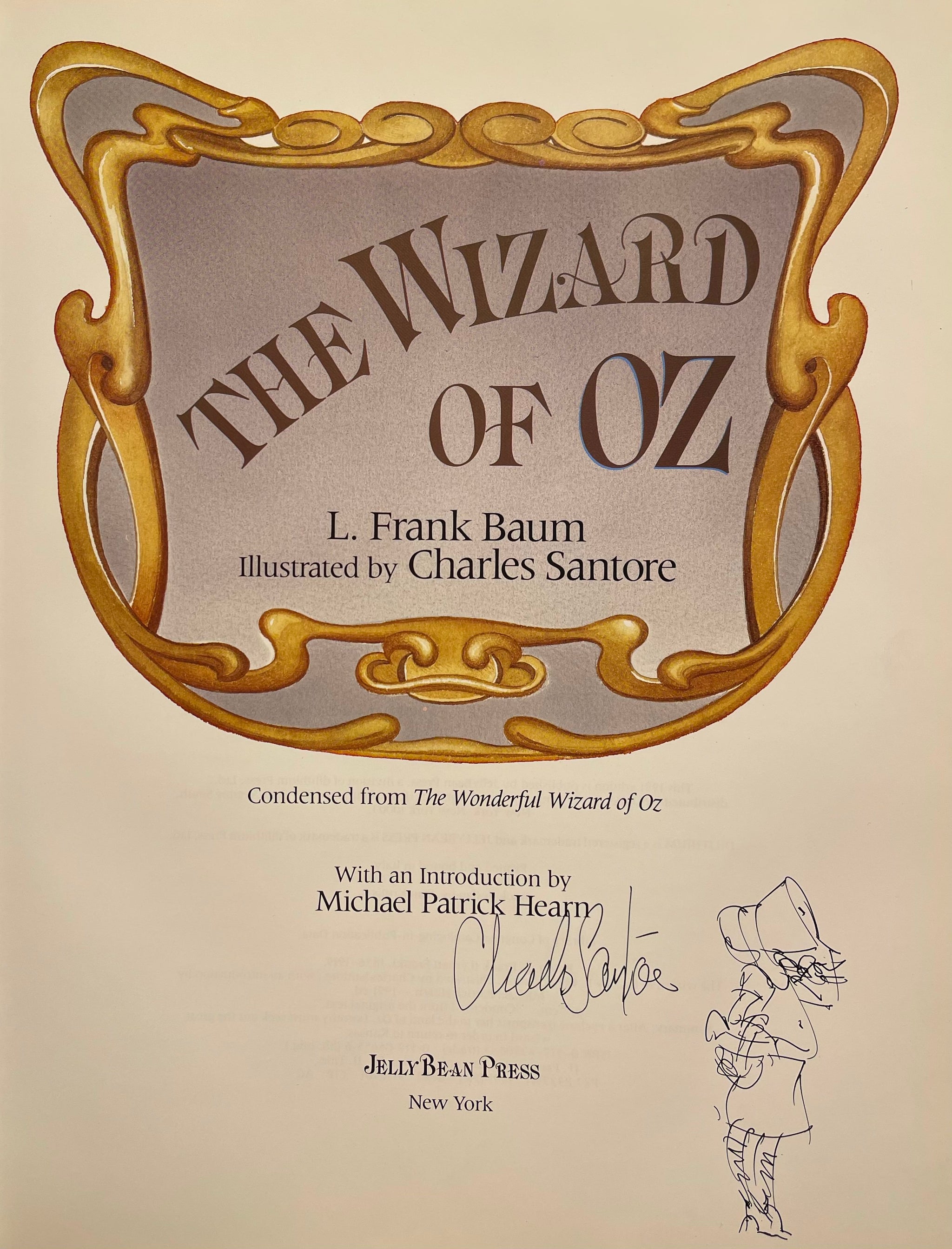 BAUM, L[yman] Frank. The Wizard of Oz. Illustrated by Charles Santore. Condensed from The Wonderful Wizard of Oz. With an Introduction by Michael Patrick Hearn. NY: Jelly Bean Press [1991]. 4to, 96pp. Color pictorial boards. Pictorial endpapers; color illustrations on nearly every page. A fine copy in original color pictorial dust jacket. Signed by the artist, Charles Santore, with a 3½-inch drawing of Dorothy.