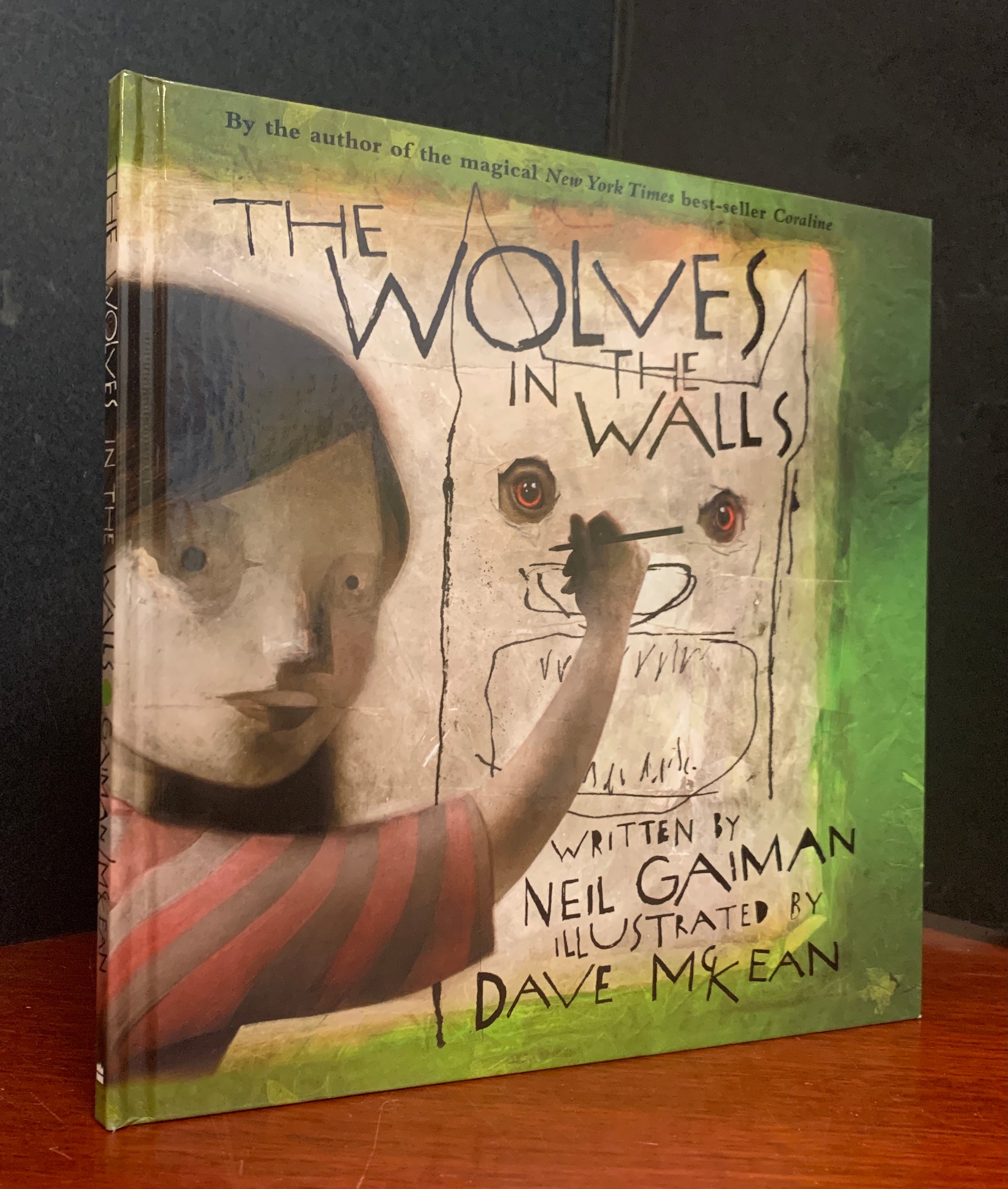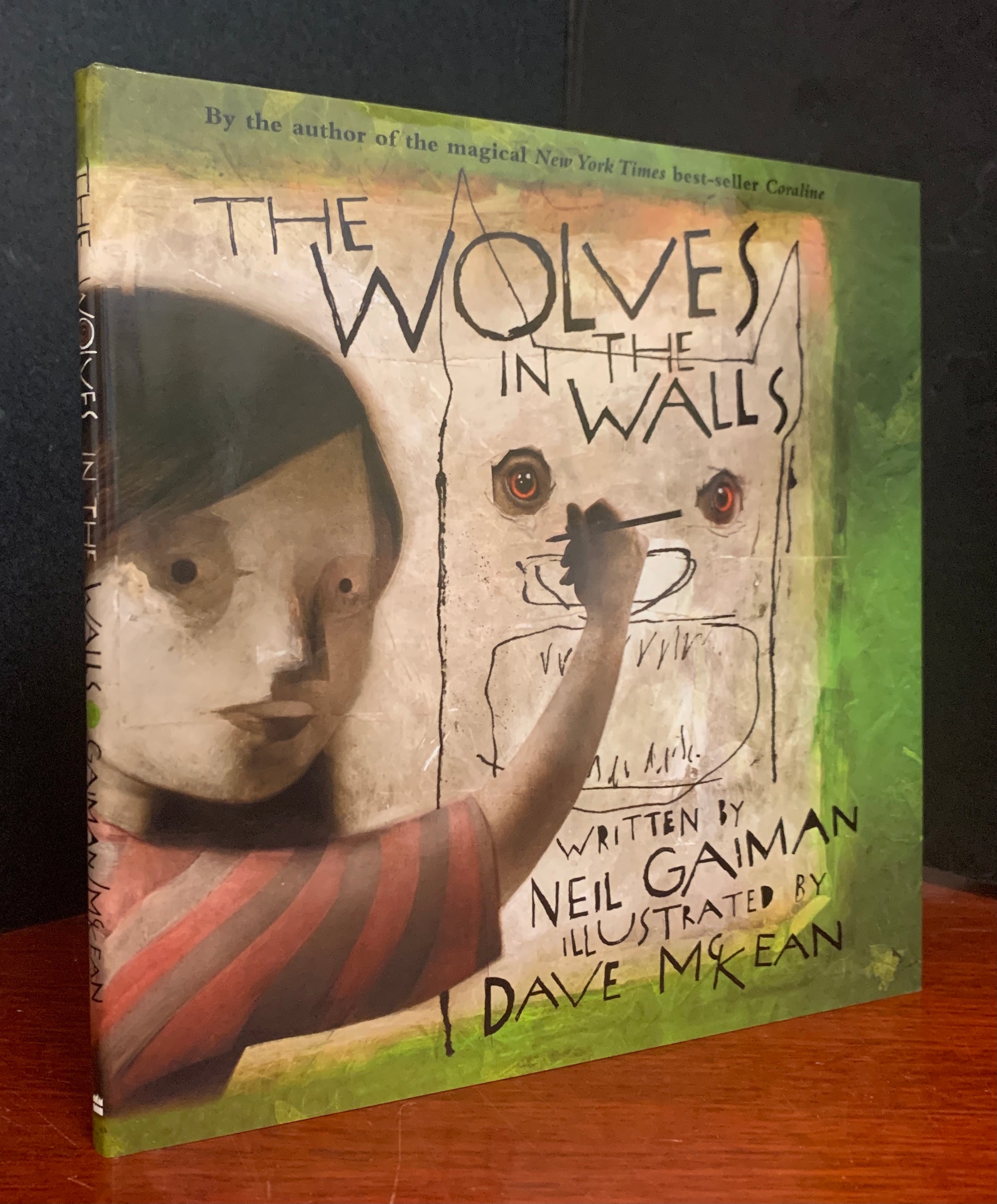 GAIMAN, Neil. The Wolves in the Walls. Illustrated by David McKean. [NY]: HarperCollins [2003]. Square 8vo, [56]pp. Color pictorial boards. Black endpapers; color illustrations on every page. A fine copy in original color pictorial dust jacket. Signed by the author, Newbery Medalist Neil Gaiman.