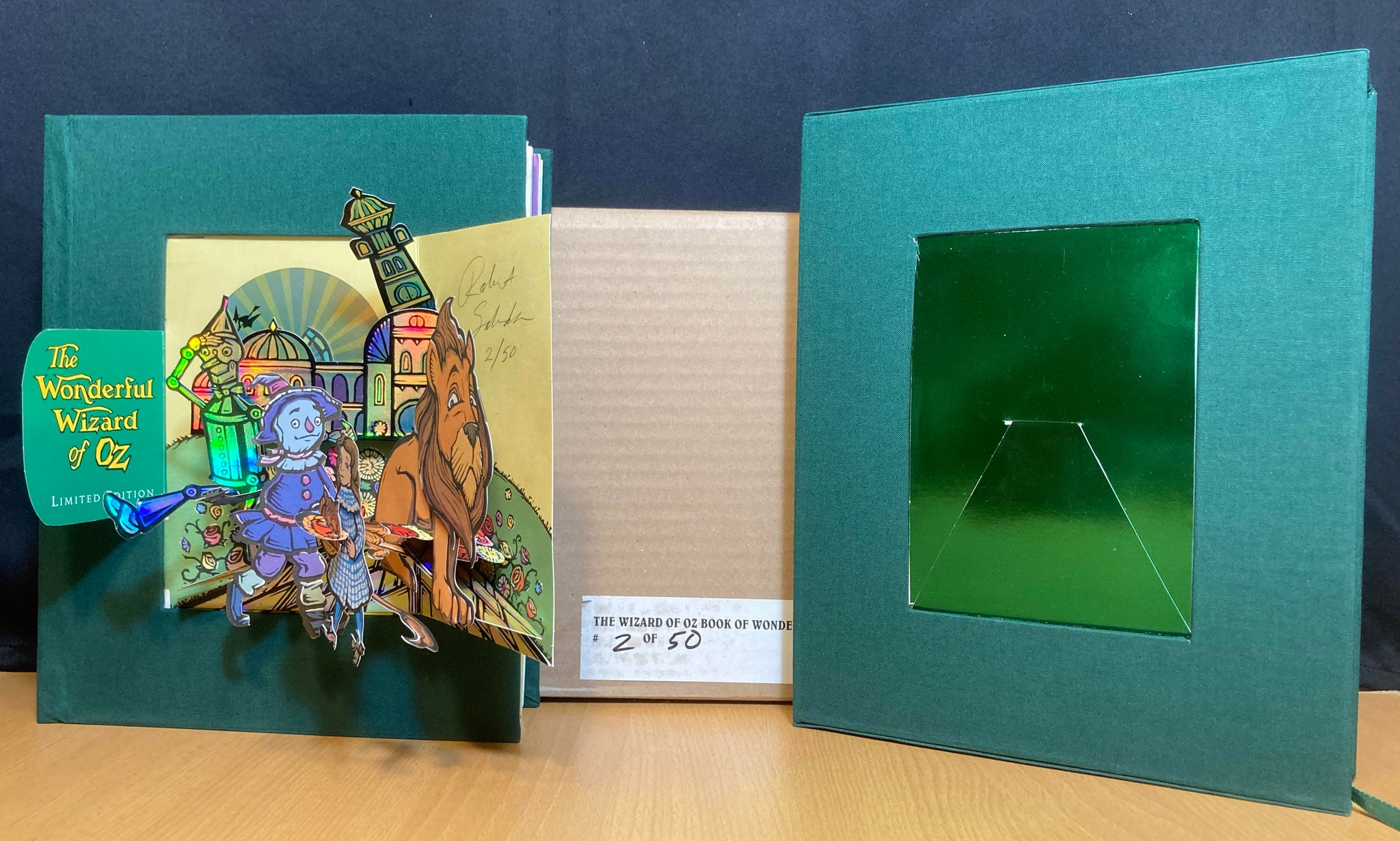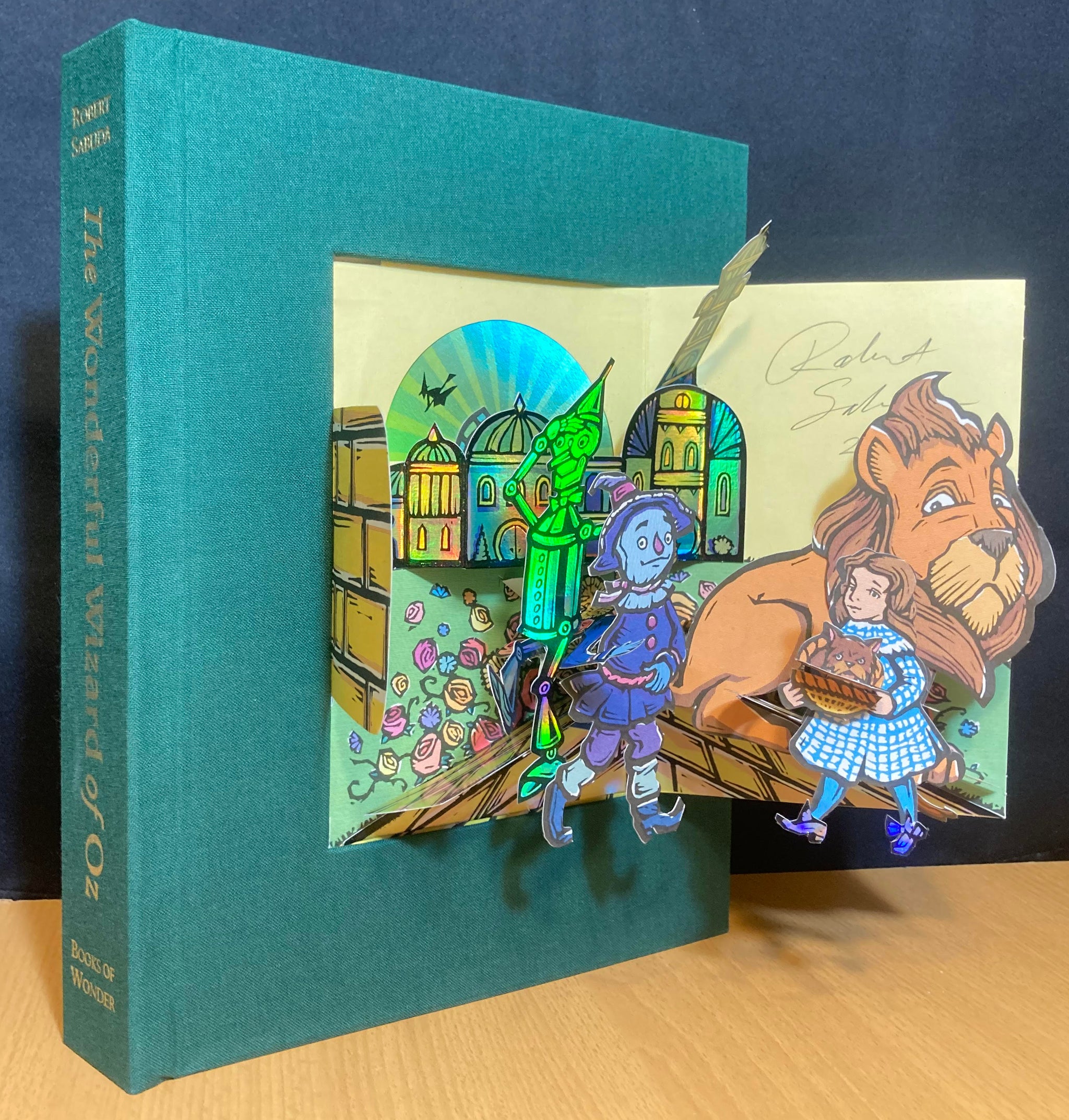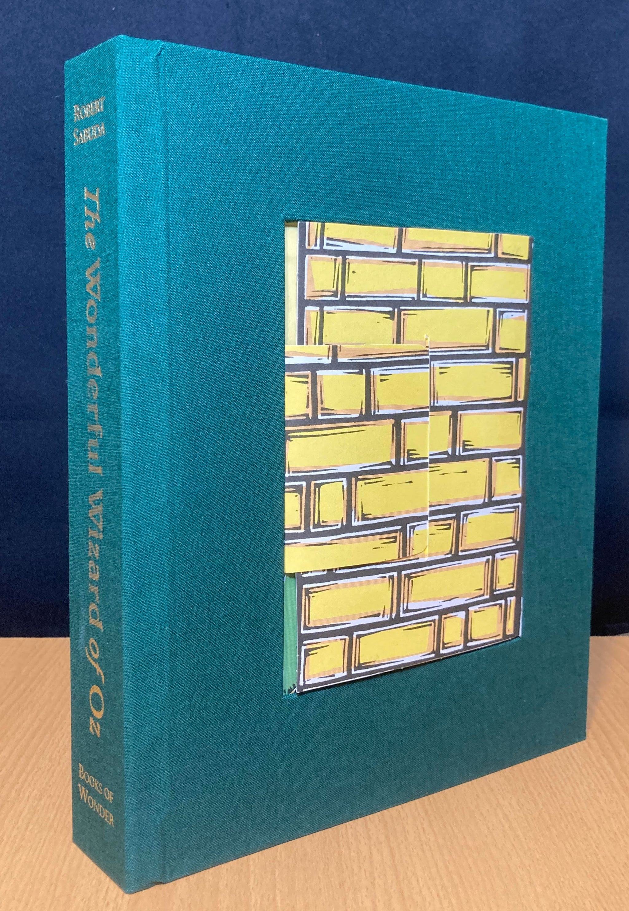 [SABUDA, Robert]. The Wonderful Wizard of Oz. [by L. Frank Baum. Illustrated with paper-engineering by Robert Sabuda]. [NY: Books of Wonder / Simon & Schuster, 2000]. 8vo, [10]pp. Green cloth with spine stamped in gold and pictorial pop-up label affixed to the box, housed in a green cloth slipcase with signed and numbered print cleverly encased in a holder inlaid on the front. A fine copy in original slipcase and box (bearing a paper label with the matching limitation number). Signed and numbered by the artist, Robert Sabuda, on the limitation pop-up on the front cover of the book and the print lid into a folding presentation holder inlaid on the front of the slipcase.