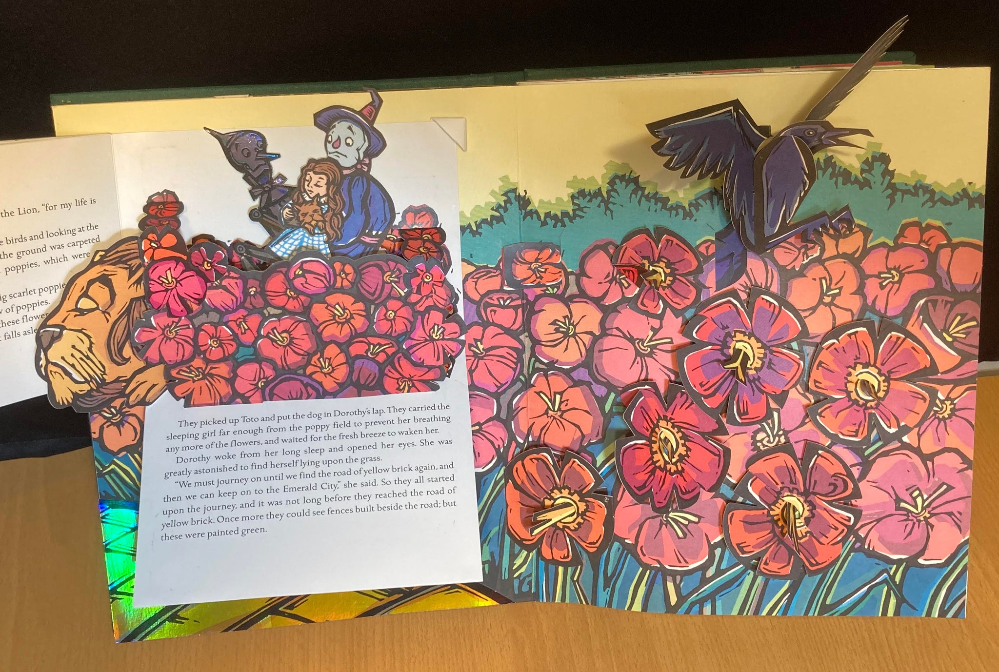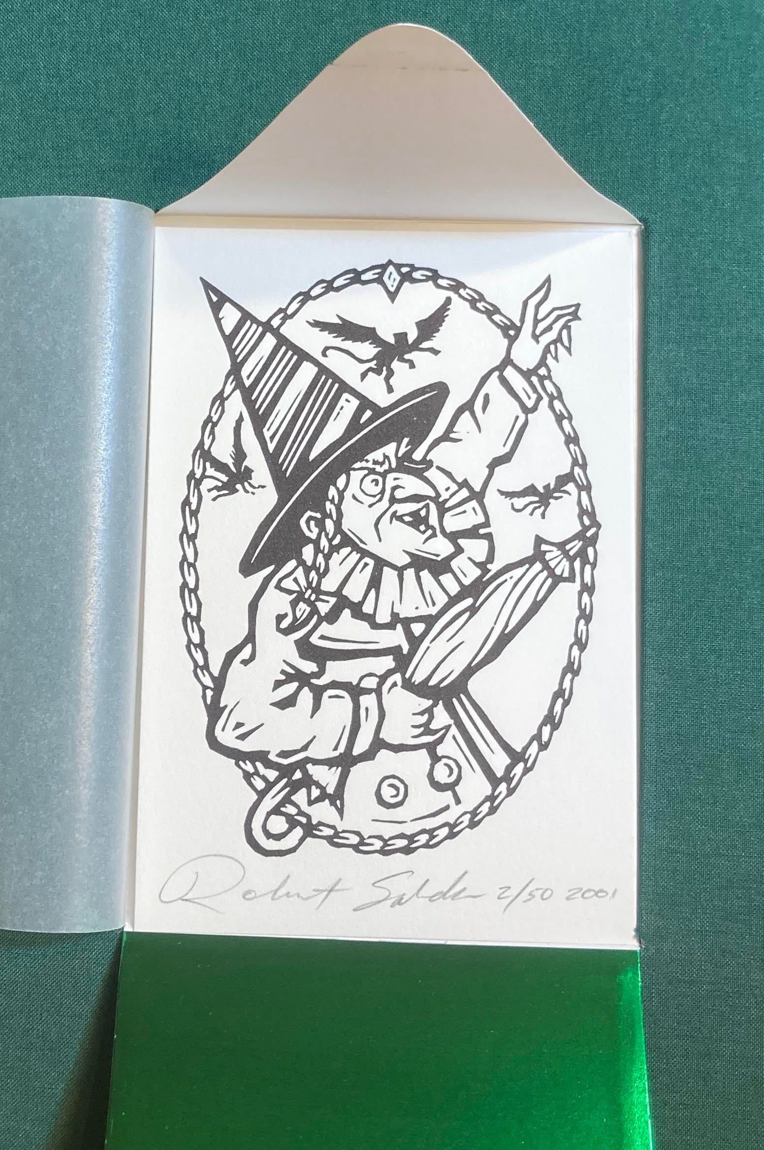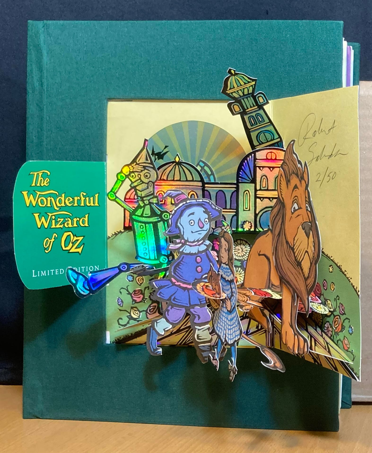 [SABUDA, Robert]. The Wonderful Wizard of Oz. [by L. Frank Baum. Illustrated with paper-engineering by Robert Sabuda]. [NY: Books of Wonder / Simon & Schuster, 2000]. 8vo, [10]pp. Green cloth with spine stamped in gold and pictorial pop-up label affixed to the box, housed in a green cloth slipcase with signed and numbered print cleverly encased in a holder inlaid on the front. A fine copy in original slipcase and box (bearing a paper label with the matching limitation number). Signed and numbered by the artist, Robert Sabuda, on the limitation pop-up on the front cover of the book and the print lid into a folding presentation holder inlaid on the front of the slipcase.